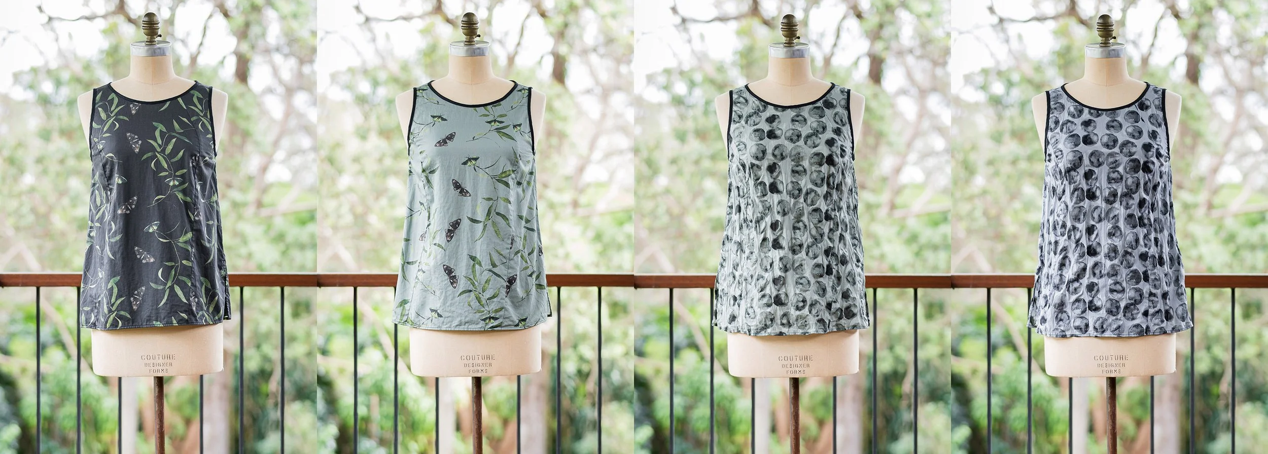 MONARCH TOPS: Paperwings digital print (dark) Paperwings digital print (light) Japanese seersucker (green) Japanese seersucker (silver)